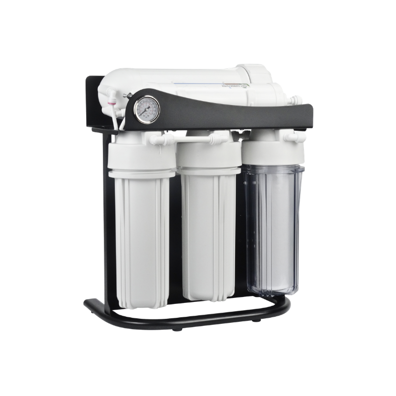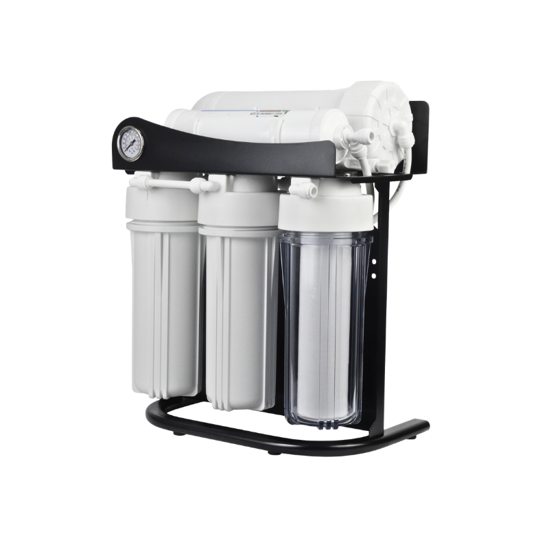 Kafe, restoran, ofis ve küçük işletmeler için tasarlanmış kompakt ticari su arıtma sistemi. Metal stand üzerinde, manometre kontrollü, 3 aşamalı filtrasyon ile şebeke suyunu içme suyu kalitesine dönüştürür. Tezgah altı veya yanına kolayca yerleşir.